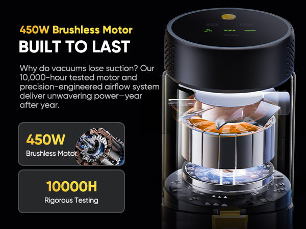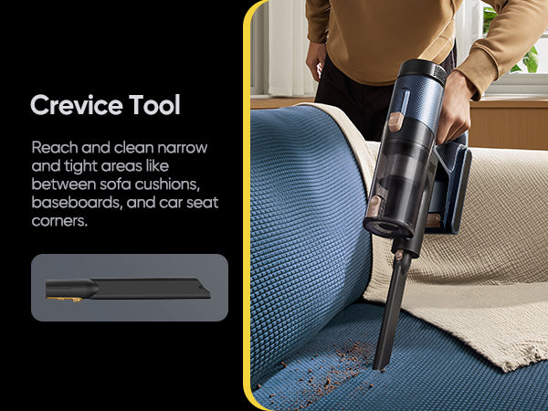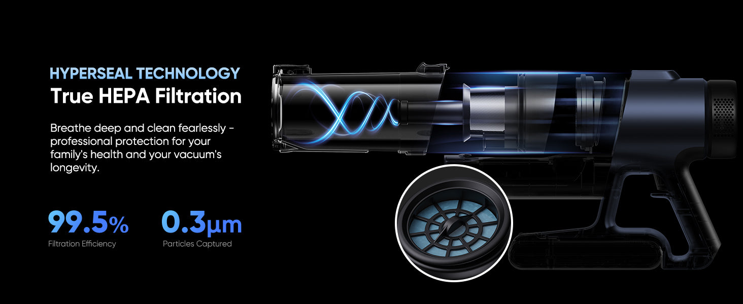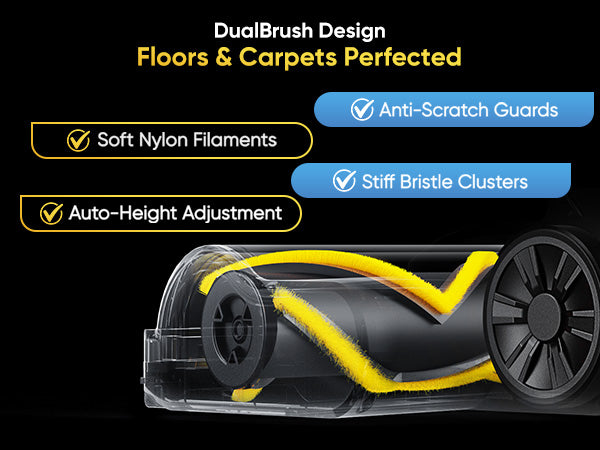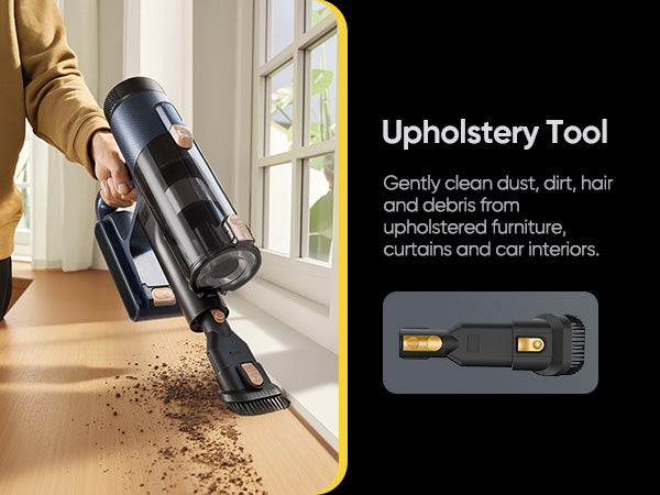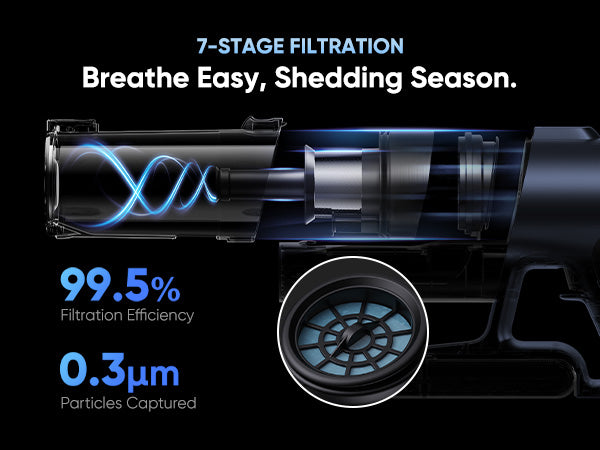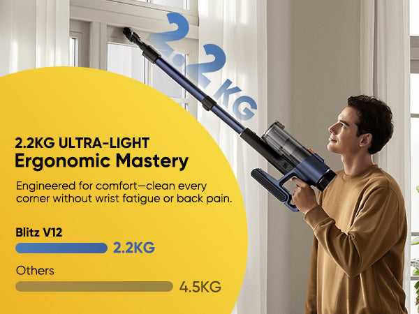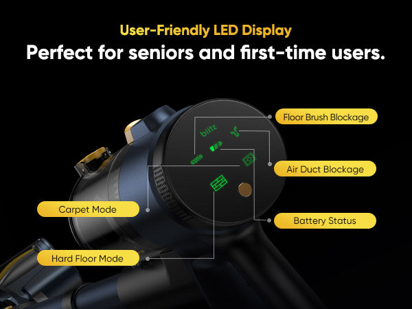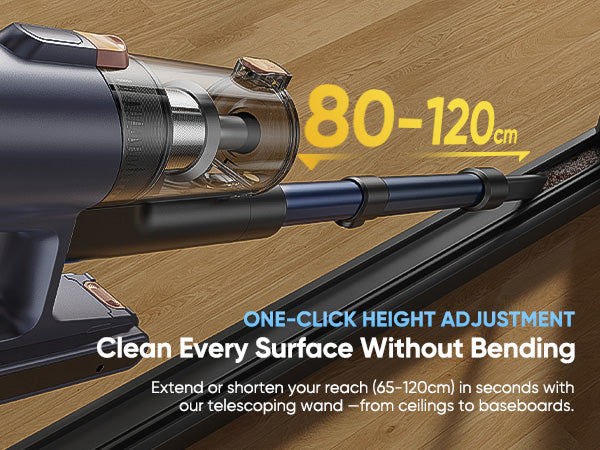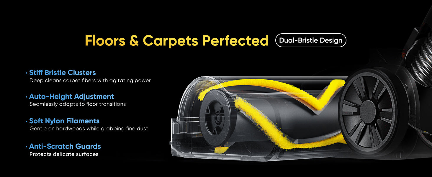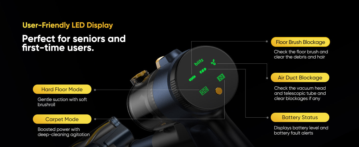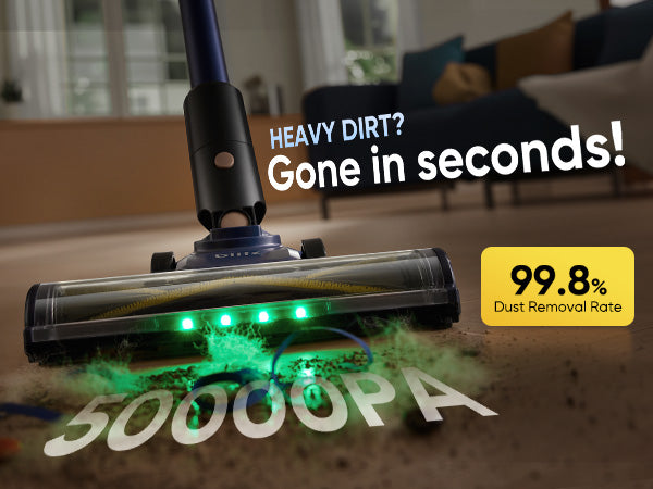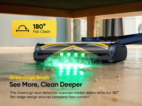 The green light projector detects tiny dust particles, and the 180° brush head easily reaches every nook and cranny.
