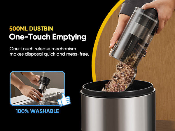 The large-capacity dustbin requires minimal cleaning, and the one-touch emptying feature makes cleaning easy.