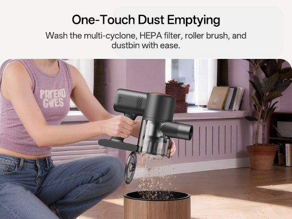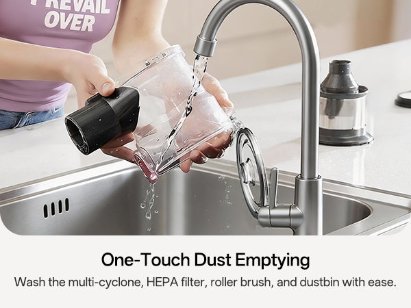 El recipiente para el polvo se puede vaciar con solo presionar un botón para desecharlo con las manos libres.