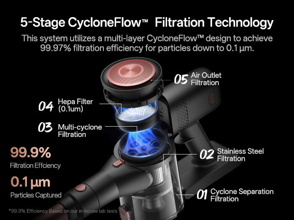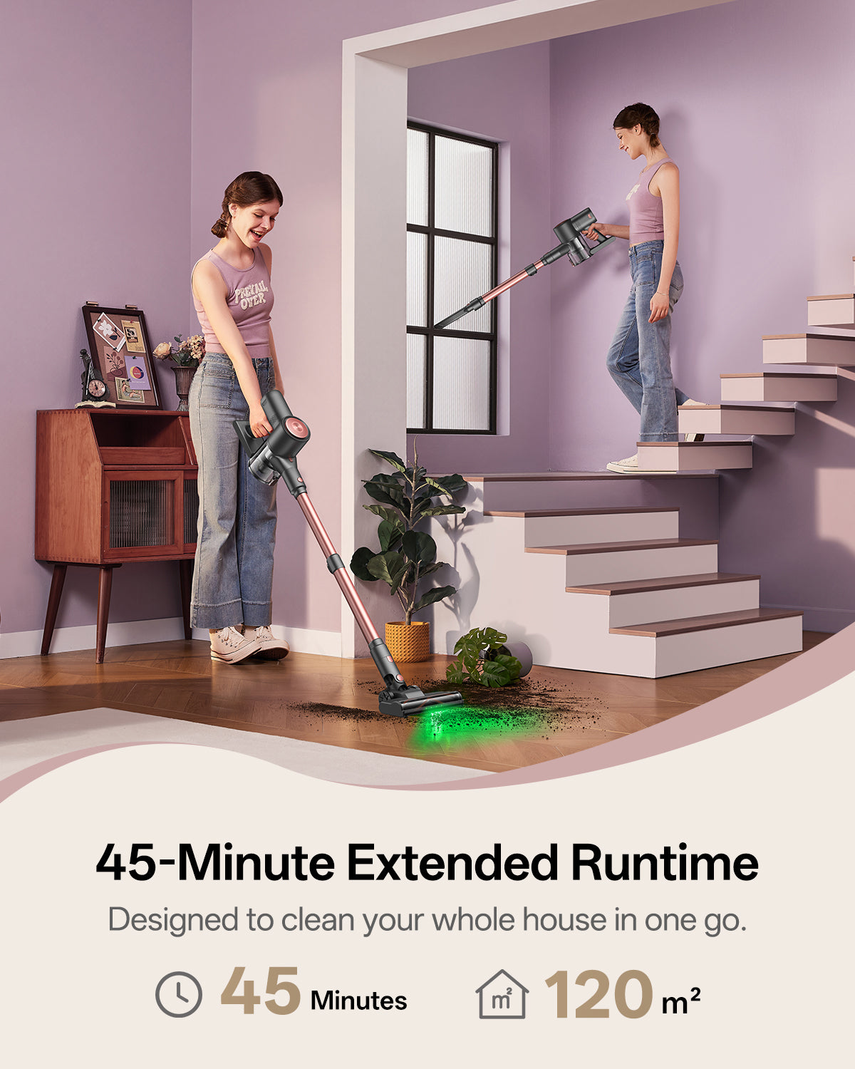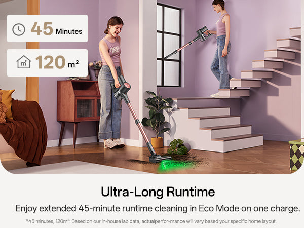 Su modo Eco amplía la duración a 45 minutos, proporcionando potencia suficiente para limpiar en profundidad espacios de hasta 120 m².