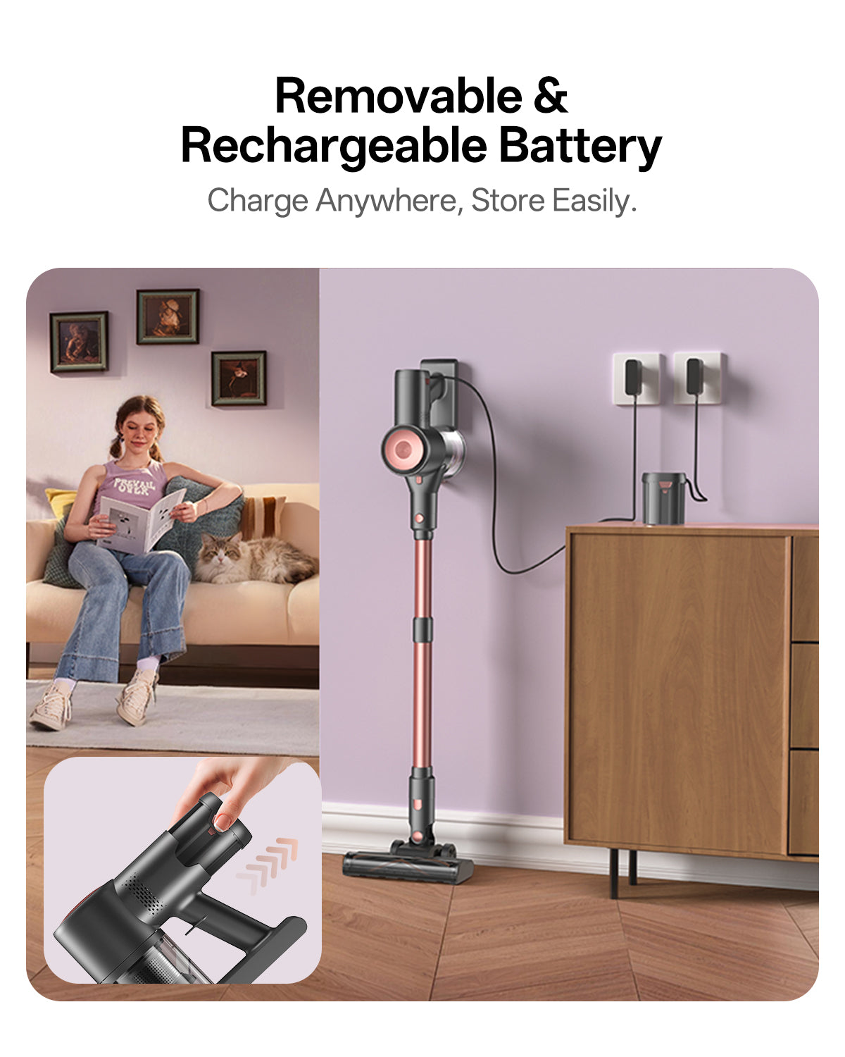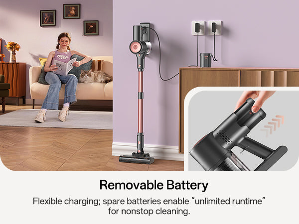 Cuenta con una batería extraíble para una carga flexible. Cámbielo en cualquier momento para una limpieza ininterrumpida o un uso alternativo.