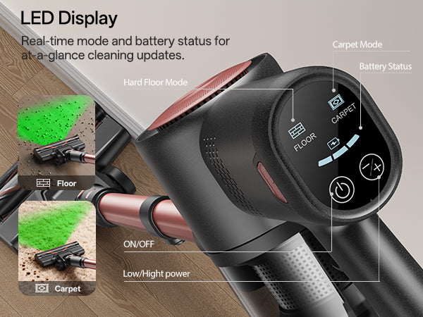 La pantalla le permite ajustar los modos de succión y proporciona una vista clara y directa del nivel de la batería y el modo actual.