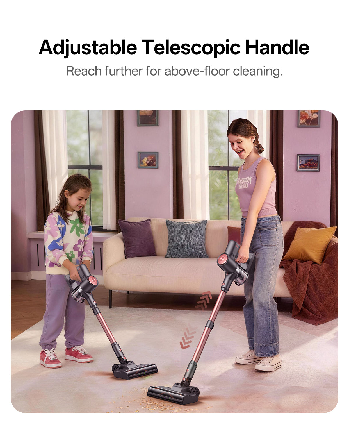 Se adapta a diferentes escenarios de limpieza y se adapta cómodamente a usuarios de todas las alturas para reducir la tensión y mejorar la maniobrabilidad.